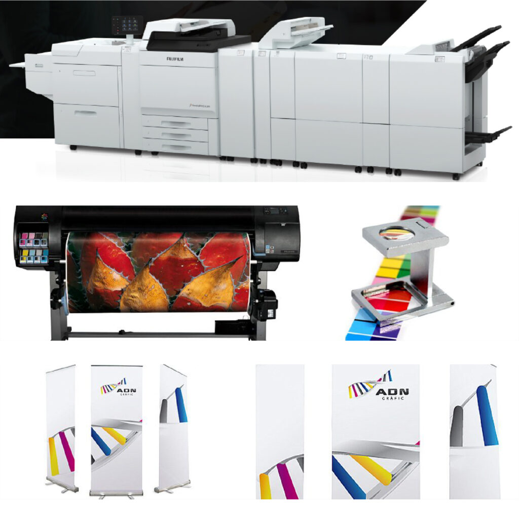 Trabajamos con equipos de última generación para garantizar calidad en todos los colores y soportes. Puedes imprimir desde tarjetas y folletos hasta grandes formatos como posteres, roll-ups, metacrilatos, lonas, vinilos o banderolas.